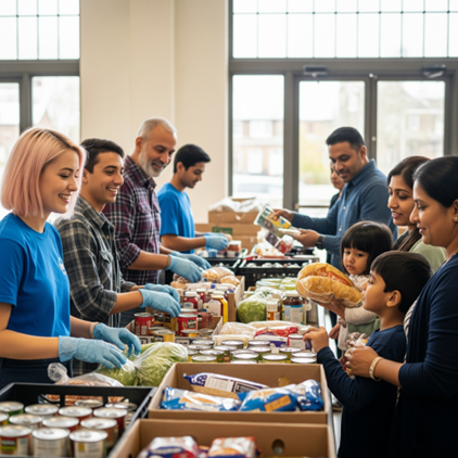 Generado por Gemini (2025). Banco de alimentos con voluntarios que donan alimentos a familias. Disponible en: http://googleusercontent.com/image_generation_content/0 Consultado: 5.6.2025.